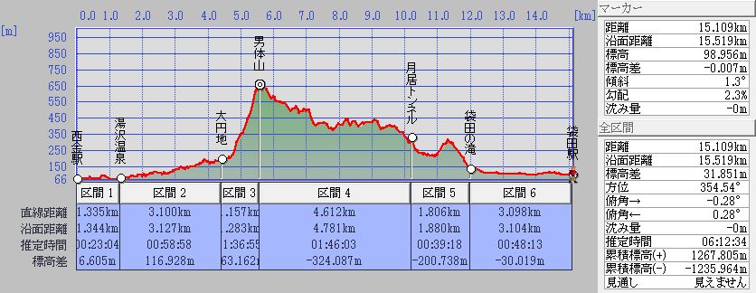 水戸駅⇒西金駅→湯沢温泉→大園地→男体山→月居峠→袋田の滝→袋田駅⇒水戸駅 水戸(10:26)より水郡線で西金駅(11:30)まで行き西金駅より歩き始める、 湯沢温泉に向けて (駅より東方面)山郷を一人歩いて行く西金駅より約20分、湯沢温泉(11:45)に着く辺りは民家が5〜6軒ありとても静かな 田園風景が楽しめる 湯沢温泉は確か2軒あったと思う、此処で道は二手に分かれる右は篭岩、亀が淵を経て竜神峡への道で左は目指す。奥久慈男体山へと続山里ののんびりしたハイキングコースで時々家が一軒現れる30分程歩くと大円地(12:05)の部落に入り15軒ほど民家が集まっている進行方向左前方には長福山が見えて来る、 前方には目指す男体山654mが見える暫く行くと登山道が二分する右は一般道、左は健脚向きらしいので左の道を行く林の中の道を30分程登ってゆくと道が急になりちょいと苦しい登りだ、暫く登ると大きな岩場(12:40)の絶壁で見晴らしの良い所に出る此処で小休止とする、長福山が目前に、さらに辿ってきた湯沢温泉方面が眺められる山頂は近いので再び歩き始めると男体山から月居峠に向かう稜線に出る 右に行った所が目指す男体山654mの山頂(13:30)だ山頂は一等三角点があり石作りの祠が祭ってある 直ぐ下に御神水が在ると聞いていたのだが涸れていて水が無かった。山頂での展望を楽しんだら稜線を戻り左に登って来た岩場よりの道を見送り月居峠に向かう、林の中の笹が繁っている道を 約く2時間行くと畑が見えてきてさらに行くと人家が見えて来る、 この辺りから少々雨がぱらついてくる月居峠に出て車道を 5分程歩き再び袋田の滝に向かう山道に入る、暫く林の中の道を行くとゴー!ゴー!と低い音が響いてくる 滝が近くにある事が解る、もう空は薄暗くなって来た、さらに進むと丁度滝が目前に見える高台の茶屋(17:00)に出たので 此処で休憩とする、茶屋のおばさんに電車の時刻を聞くとまだ時間は十分あるのでゆっくりと滝見ができる しかし大きな滝だ日本三大瀑布の一つに成っているだけ有る 幅が広くて4段に落ちている滝で水量も豊富なので偉大さが増す。 十分滝を見学したので、袋田駅まで歩いて行く滝から約500m程行った所に本造2階建ての旅館があり直ぐ先で月居峠から伸びてくる 道と合流して袋田駅(17:00)に到着する |