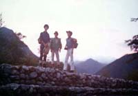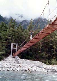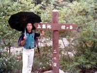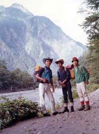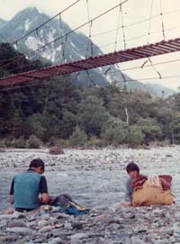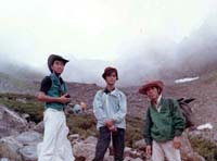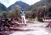 、 9月1日今日も天気は曇り空で時々雨になっている、今日は荷物を纏めて小屋に置いて東京より来た人と4人で槍ヶ岳登山を開始する肩の小屋まで30分そこから槍ヶ岳山頂まで岩登りを30分ほどで、第4番の標高槍ヶ岳山頂3179.5mに着くガスが濃くて視界は悪いが時折ガスの切れ間より東鎌尾根が見える。山頂に30分程いたが、とても天気の回復は望めず下山する事にする、 下山途中で槍ヶ岳登山記念に槍ヶ岳に似た石(3キロほどあり)を持ってくる。殺生ヒュッテに戻りザックを引き取り槍沢を下る、時折雲間より陽が指して来る雨が上がったので良かった。下山は登りよりハイペースで歩けるが長いコースだ途中川の水で顔を洗うとても冷たいので気持ちが良くすっきりする槍沢小屋、二の俣、一の俣と過ぎて横尾に到着置いてあったテント等を持って上高地に向かう帰りは新村橋を渡り明神池を通って河童橋に出る
