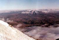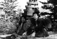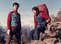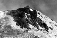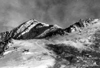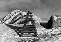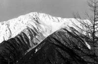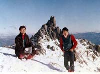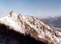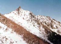 一瞬 Oh!と歓声を出してしまう T氏に思わず 見えたぞーと振り返り声を掛ける 登るにしたがってオベリスクがハッキリと目前に見えてくる 鞍部より約30分とうとう観音岳山頂に辿り付く 鳳凰三山の最高峰2841mの観音岳山頂は遮るものが無し 最高の眺望だ此処で写真を撮りながらの小休止 念願のオベリスクを目前にして感無量! 更に奥の方角に多少ガスが掛かっているが甲斐駒ケ岳の雄姿が望める 写真を撮り終わり地蔵岳に向かう オベリスクが一歩一歩近づいてくる いったん観音岳とアカヌケ沢の頭とのコルに出て鳳凰小屋へ直接行く路を右に見送りアカヌケ沢の頭への登りとなるこの当りは稜線が細いので慎重に歩く 足が雪の中に50〜60cmほど入ってしまい とても歩きにくい この当りの斜面にも霧氷が多い観音岳から1時間ほどでアカヌケ沢の頭に到着 風がいくらか強くなって来たので岩陰に隠れて小休止目前のオベリスクを何枚も撮影する 二人とも角度を変えてはシャッターを切る 此処には 撮影の為15人ほど思い思いにカメラをオベリスクに向けている フイルムが無くて困っている人がいたのでフイルムを一本差し上げる 早速オベリスクに向かってシャッターを切っている 天気は悪くないが風が冷たくて指が思う様に動かないし頬が寒さで硬くなり口が思うように利けない おかしな話し方に成ってしまい 互いに顔を見合わせて笑ってしまう。写真を何枚も撮る 寒さが身に応えて来たのでそろそろ直ぐ下の鳳凰小屋目指して賽の河原に降りる事にする地蔵岳とアカヌケ沢の頭とのすり鉢状になっている斜面を一気に降る この当りは雪が無ければ野仏が多く有るところだが今日はあいにく雪に埋もれて姿が見えない