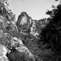 鳳凰小屋より再び下山道を下る 緩い降りが続き時々林の合間より地蔵岳や甲斐駒ケ岳が姿を見せる2時間ほどで燕頭山に着くあまり展望は望めない一面に熊笹が繁っている 木立の間から観音岳が大きく見えて来た、少々ガスが掛かっている 暫くカメラを構えてガスの晴れるのを待っていたが晴れそうも無いので再び下山路を辿る、