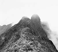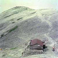 ガスが完全に晴れるのは期待できないので 引き返す事にする ロバの耳の頂きに来るとガスが切れそうになってきたので カメラを向けて待っていると ガスの切れ間より特異な姿の岩峰 ジャンダルムが見えてくる 素早く チャンスを逃さずカメラに収める 日本有数の岩峰を十二分に味わったので F氏が待っている事もあるので 奥穂高山頂に戻る F氏は既に穂高山荘に下山している I氏は直ぐにF氏の待っている 穂高山荘に下山する 私は暫く奥穂高山頂で撮影をしてから最後に下山する ガスが濃くなって来たので明日は 天気が崩れて来そうだ 穂高山荘に着いたのは6時頃となり小屋の前で2人とも休んでいた 早速夕食の準備に 取り掛かり食事をしていると小雨が降ってくる急いで後かたずけを済ませて小屋に入る 寝床で荷物の整理をしてから 読書室に行き暫くジュースを飲みながら本を見ていると山の8ミリ映画を始めると連絡があり 見に行ったが直ぐに終わりになる 消灯が近いので寝床に入って寝る事にする。
