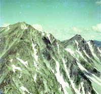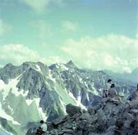 私たち3人は上高地より 梓川沿いに林道を行く 暫く行くと 左手に岳沢登山口の標識がある 此処で登山準備をして岳沢ヒュッテを 目指して登り始める 天気が良いため陽射しが強くてとても暑い 途中何度か休みながらの登山となる 時々降りて来る人に出会う 顔は真っ赤に日焼している 上高地より3時間50分今日の宿泊予定地岳沢ヒュッテに到着する 宿泊手続きを済ませて直ぐに夕食の支度に取り掛かる 小屋からビールを2本買ってきて食事前の乾杯とする 食事も手際よく済ませ明日の予定など話していたがF氏は頭が痛いので先に寝床に入る 後片付けを済ませてから寝床の準備をしていると お風呂に入れるというので 早速行くと 5人ずつ10分間とゆう制限があるので急いで お湯に浸かってくる 思い掛けなく風呂に入れて 今日の疲れも癒される 今夜はゆっくり休めそう 先に寝床に入っているF氏の頭の痛みは良くなってきた これで一安心 8時ごろ床に着く。 7月26日3時30分起床 空はまだ暗いが天気は良いらしい 食事の準備をする為2階から降りるときに足を踏み外して落ちてしまう 幸い少々の傷みがあるものの登山には影響は無いので 小屋の外に出て朝食の準備を開始 お湯を沸かして カップうどんとお茶を作るF氏はまだ調子が悪くて お茶のみの朝食となる 4時40分岳沢シュッテを出発し前穂高に向かうキャンプ場を過ぎどんどん登る 森林限界を過ぎ岩場をさらに登る 8時30分前穂高岳3090mの山頂に到着天気は良好360度の展望があり お茶とコーヒーで休憩しながら記念撮影 前穂高発9時30分奥穂高に向かう一度降って(吊尾根)再び登りとなる F氏は体調が良くないのでスローペースとなる奥穂高山頂まであと僅か 目前に日本第三位の標高の頂きが迫って来る 苦しい登りが続いたがとうとう奥穂高3190mに到着 此処で昼食にして十二分の休息をとる F氏は体調が回復しないので I氏と二人で目前に聳えているジャンダルム(穂高の稜線上にある岩峰の名称)まで行って来る事にする 荷物は山頂に置いてカメラのみを持ってガレ場を5、6分降ると馬の背(ナイフリッジ)と言う幅の狭い稜線の降りとなる さらにガレ場を降ると小さなコル(鞍部)に出て次に通称ロバの耳の登りとなる ロバの耳の頂きに立つと 隣に目指すジャンダルムが立っている ロバの耳を降り ジャンダルムの登りは裏側に廻り込む様に登って行く 10分程で感動の山 ジャンダルムの頂きに立つ ジャンダルムの頂きで10分ほど居たが ガスが刻々と変化して来るのでガスの切れ間に周りの情景が映し出される