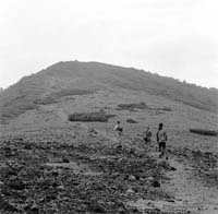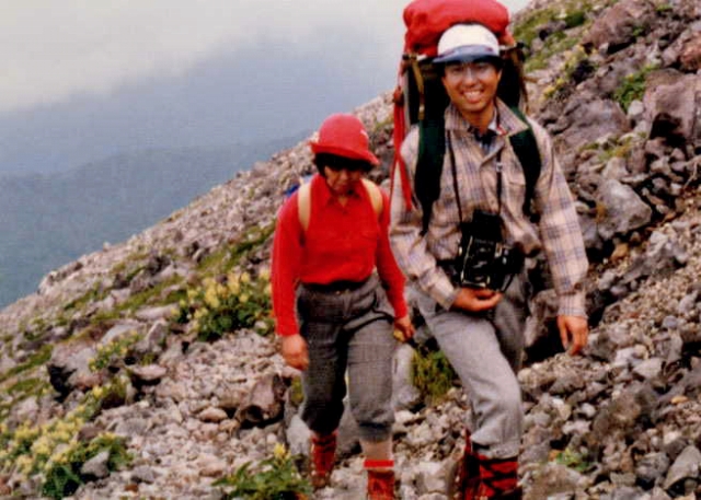 車はここまでで後は歩く事になる3時35分登山開始、 懐中電灯で足元を照らしながらの登山となる 100mほど歩いた所で水を補給するのを忘れたことに気が付き茶屋まで引き返して水を補給してくる 峠の茶屋はまだ夜中なので閉まっていたが外に水道があったので助かった。 真夜中の山道を懐中電灯の 明かりを頼りに峰の茶屋を目指す。時折り雲の合間より月が顔を出すが直に隠れてしまう。20分程登ると 岩のゴロゴロした緩やかな登山道となり茶臼岳と朝日岳とのコル(鞍部)に峰の茶屋が見えてくる。 歩き始めて約40分峰の茶屋に到着する。空もだいぶ明るくなって来たが天気は良くないみたい。 此処でザックを降ろしてお茶や、コーヒーを作って飲みながらの早い朝食とする。小屋は無人でベンチが 6台ほど設置してある。小屋は岩と木の粗末な作りだが雨風は凌げるので登山者にはありがたい施設だ。 強い風が裏の谷から吹き上げてきてじっとしていると寒くなって来る。辺りに有るごみや木で焚き火をして 体を温める。 真夏だと言うのにやはり山の気候は平地と著しく違う事が明確に解る。一時間程休んでいると 二人の登山者が登って来る、暫らくすると徐々に登山者が多く登って来る、一番のバスが到着したみたいだ。 何人かの登山者と一緒になって茶臼だけを目指す、茶臼岳へと続く登山道は峰の茶屋より右回りに半周回って 山頂に続いている 途中でロープウェイ駅からの登山道と合流して岩のゴロゴロしている緑の無い登山道を登って 1915mの山頂に出る。峰の茶屋から約50分。山頂からの展望は あいにく候が悪いので望めない。時折り霧の晴れ間より黒磯方面が見える、目前の朝日岳山頂は霧でまったく 見えない。お釜を一巡りして再び峰の茶屋前の分岐点まで下山する。 分岐点よりガスの噴出している所を風向きを 交して素早く通過すると牛首と言われている十字路に出る、I氏とN氏二人が一時間程遅れてくる。 峰の茶や付近でお茶を作って飲んでいて遅れてきた。此処は茶臼岳と緑の南月山との中間で広々とした 明るい所なので約1時以上休憩をする。 二度目の朝食となりのんびりする。T氏は食欲旺盛だ、元気でよい事だ。 10時30分出発する牛首を境として山のムードは一変する。米ツツジの小さな白い花、ミヤマシャジンの 可憐な薄紫の花などが周りの這い松の緑と熊笹の緑とがマッチしていて登山者の疲れを癒してくれる。 感動する一時になる「感動の山」!北アルプスの槍や穂高などはアルペンムードは満点だが静かな山歩きは 到底不可能だ。南月山は訪れる登山者も少ないので静かなのんびり山歩きには最高に良い所だ。 さらに天気も回復して来ているのでなおさら癒される。後ろを振り向けば頭を霧で隠した茶臼岳の斜面を 一列になって大勢の登山者が登って行く影が小さく眺められる。 南月山から先は急な降りとなり黒尾谷山とのコル (鞍部)まで一機に降る途中で一時雨が降って来たが直ぐに止んでしまう。降りの惰性で次の登りを登り始めたが 直ぐにペースがダウンする、無理をすると余計疲れるので小休止する。やはり登りはきつく汗が出るし疲れも出る、 黒尾谷山頂に12時10分到着ちょうど昼時なので展望の無い山頂を通過して10分程降った所で展望の良い大きな 岩がある所に出たので荷物を降ろして昼食にする。最後の食事となるのでザックより食べ物を全て出して見るミカンの缶詰、 あんみつ、きゅうり、パン、その他、今回は良く食べる山登りだ12時40分下山開始、 樹林帯の中をジグザグに 降る道が暫らく続く、足元には小柄なギボシ(ミズギボシ)が群生している。紫の可憐な花が登山道に沿って咲いている。 1時間ほど降ると那須高原の別荘地帯に出る別荘地帯までミズギボシの花に癒されながら降ってくる。 40分程別送地帯の道路を歩くとバスの通っているハイランド入口に辿り着く。 公衆電話でタクシーを呼んで 湯本温泉で湯に浸かり今日の疲れを癒してから帰ることにする。タクシーを待っている所を間違えて 連絡したので。少々遅くなってしまった。湯本温泉鹿の湯に入る木組みの枠で出来ている昔ながらの 混浴温泉だ谷川に沿って木造切妻の建物の中に6槽一列に温度別並んでいる、中間に衝立が置いてあり地元の 老人らしい人が多く浸かっている。 温度の高い湯に入ってしまったので直ぐに出て温度の低い湯に浸かりなおす。 汗をかいた後なのでサッパリする。外に出て水で顔を洗うとさらにサッパリする同行した両女子は近くの 共同浴場へ行って湯に浸かってきた。16時20分タクシーに乗って黒磯駅に戻る。列車の発車ぎりぎりに 着いたので切符を買わず列車に飛び乗る。 乗ってから解ったのだがこの列車は大宮行きの鈍行列車なので 意外と空いていて席は空いている後の急行に乗り換えても20分程しか違いがないのでこのままゆっくりと 座って帰れる大宮、赤羽、渋谷と乗り継いで22時に帰宅、楽しい登山で長い一日となった 上野⇒黒磯 2500 東京⇒黒磯 2500円 黒磯⇒