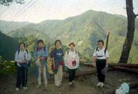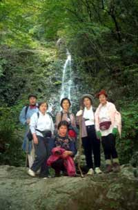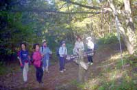 山頂での楽しい昼食も終わり、いよいよ浅間嶺山頂を後に時坂峠を目指す、初めのうちは尾根筋の緩やかなのんびり歩ける登山道で、話しが弾み笑い声を響かせながら降ってゆくと次第に降り勾配がきつくなり足元に注意を払い慎重に降ることになる、時折急坂を登ってくる人にすれ違い、頑張って!!と励ましの声を掛ける。 急なくだりも終わり樹林帯を抜けると茶店が一軒ある車道に飛び出す、時坂峠で展望が良く目前に大きく御前山と右方向に大岳山が大きく見える。 時坂峠の茶店で休憩する、茶店には名物のお土産も置いてあるし目前山々の展望も楽しめる。ゆっくり休憩が出来たので、再び歩き始める、車道を少し歩き再び林の中の登山道に入って降って行く。 林を抜けると山里の叙情が漂う民家の際を通過したりして道幅が次第に広くなり払沢の滝入口に出る。太陽もだいぶ低くなって来て、空が赤味かかってくる。滝を見に10分ほど沢に沿って歩いて行くと、奥多摩の名瀑”払沢の滝”が現れる。 滝の前で記念写真を撮ってから滝の近くにある喫茶店で 浅間嶺ハイクの完歩会、秋空の下、好天に恵まれてのハイキングで大自然に浸り、みなそれぞれ大いに満足感を味わえた。皆さんお疲れ様でした。帰り道は払沢の滝入口よりバスで武蔵五日市に戻り五日市線で各方面に帰る。 |