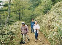 車の通れる林道を勝縁荘まで歩き、勝縁荘より登山道となるが荷物運搬用のキャタピラ車が通れる様に道が整備してあり楽に歩ける。始めは新緑の初々しい樹林帯の中を緩やかに登って行くが登るに従い空が広がってきて峠が近いと感じるつつじの花が一段と周りの緑と対照的に引立っている。歩き始めて約30分さらに空が広がり大菩薩峠1897mに出る。 峠の道筋に沿って両側に山小屋が軒を並べている。あいにく展望は梅雨空で望めないが気持ちの良い草原状の尾根が目前に続いている、峠で小休止した後尾根を登り始めると直ぐに大菩薩峠を全国的に有名にした中里介山の文学碑が立っている。目前の登山道を登ってゆくと親不知の頭の標柱が立っている。親不知の頭より振り返り下方を見ると先ほど車で通過した工事中の所は大きなダムを作って人造湖が出来ているのに気が付く。 大菩薩峠よりの景観も大きく変ってしまう事に複雑な気持ちになる。親不知の頭を越えて降った所が避難小屋の建つ賽の河原で、此処は旧峠で霧が出たりして視界が悪い時には注意が必要だ。大菩薩峠から雷岩までの約1時間のコースは草原状の尾根で展望は最高に良い所だ、登山者に人気がある理由は展望が良く雲の上を歩いている様で気持ちよく楽に歩ける事が要因となっている。 今日はあいにく梅雨空で遠くの視界は無いが充分大菩薩峠の良さを味わえる。所どころに岩が露出する草原状の登山道を登ってゆくと神部岩で左に降る富士見新道(通行禁止)を見送り、さらに10分程登ると雷岩に着く此処は大菩薩で随一の展望地で視界がよければ目前に御坂山塊、富士山、南アルプス、と連なる大パノラマが展開する。 雷岩韓は車を停めた近くの福ちゃん荘まで登山道(唐松尾根)が通じている。雷岩の展望地を通過して最高地点の大菩薩嶺に向う。雷岩からは草原と分かれて薄暗い樹林帯の中にはいって行き10分程で3等三角点のある大菩薩嶺2056mの山頂に着く。標高が高いせいか霧が濃くなって時折り霧雨状態になってくる。30名ほどの登山者が休憩をしているが、あいにくの天気なので早々に登山開始として山頂を去って行く。 霧が流れる行く山頂で記念写真を撮り我々の雷岩まで引き返す。帰路は雷岩より直接唐松尾根を降る事にする。雷岩よりほぼ一直線に降るため道が急で注意が必要だが霧もあがり視界も良くなって来たのでのんびり降る事が出来る。降るに連れて草原から樹林へと変って行き新緑にまざって紅色の蕾が今にも花を開かせそうに輝かせている。またツツジの花がピンク色に一際新緑に映えている。 唐松の繁る林の中に入って来ると次第に登山道も緩やかになり福ちゃん荘前に飛び出す。福ちゃん荘前の林道を僅かに戻り富士見山荘手前の車を置いてある所に戻る。 車に乗り込み帰路を辿る上日川峠に戻り田野の天目山景徳院に寄って甲斐の武田家終焉の地を散足して歴史の一端に浸ってくる。景徳院境内には色々の花が所狭しと咲いている。 景徳院を後に国道20号線に出て直ぐに甲斐大和道の駅があり此処に寄ってお土産等を買って帰る。何時からか地名が変ったらしい。以前は中央線の初鹿野駅が近くに有ったのだが、今は甲斐大和と改名したらしい。 |