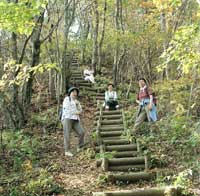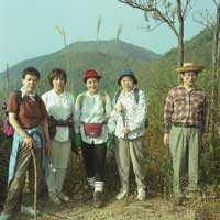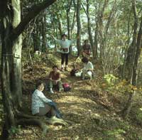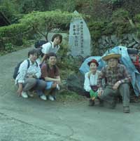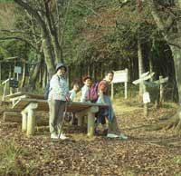 展望の無い雑木林の中の尾根道を暫らく行くと次第に開けてきて展望の良い尾根道となる道も緩やかになり草原状の広い登山道は気持ちがよく歩ける。また当り一帯には竜胆の花が多く咲いていていっそう楽しませてくれる。再び急な登りとなり連行山山頂に着く、連行山を過ぎると右手に柏木野に降る道を見送りコース中一番標高の高い茅丸1019mを目指す。 この当りも実に静かな雑木林の明るい登山道で気持ちが良い、天気も快晴で雨の心配は皆無だ。連行山より緩やかに降り再び急な木階段を登り詰めると1019mの茅丸山頂に出る、山頂には木製ベンチが2機設置してあり休憩するのには丁度良いしかし山頂は広葉樹林が多くあるので展望はあまり良くない,茅丸山頂で一息入れてから急な降りを生藤山目指して行く。 広葉樹林帯の明るい緩やかな道となり暫らく行くと急な登りとなり上り詰めた所に生藤山山頂990mがある。山頂には茅丸と同じくベンチが2機設けてあり休憩するのに丁度良い方向に向いている、こちらは南側が展望が利く北側は雑木林で視界を遮られている。生藤山山頂からは露岩の急な降りを木に捉りながら10mほど降ると巻き道に合流する直ぐに巻き道がある三国山の登りとなって直ぐに展望の良い広い山頂に出る、 奥多摩方面の山波が目前に連なって見える、眺めが良い所なのでゆっくりしたくなるが先を急ぐゆったりとした降り道を10分程行くと明るく開けた桜の林出でるテーブルが3基設けてあり此処で暫らく休憩とする。甘草水広場の標識があり「...日本武尊尊が遠征のとき三国峠に軍を憩う時に山頂に水が無く....鉾で岩頭を穿ったところ清泉が湧き出した...」と甘草水由緒が記されている。 この当りにも竜胆が多く紫色の花を咲かしている。甘草水からはほぼ平坦な樹林帯の道を20分程行くと佐野川峠で右に石楯尾神社に降る道を見送って暫らく行くと軍刀利神社があり此処から尾根道と分かれて登里に降る初めは明るい雑木林の道を降って行くが暫らく降ると杉林の中の急な降りとなって登里に出る3軒ほど家があり、三国山、生藤山登山口の石碑が立っている。 コンクリートの坂をカーブしながら降ると行きに車を停めてある鎌沢(竹の子の里活性化センター)に着く到着が遅くなってしまったのでセンターは閉まっていて 近くの「守屋さん宅に予約しておいた名物の酒饅頭を預かってある」とメモが貼り付けてある、車に乗り込み少し降った所の守屋さん宅に寄って酒饅頭を貰ってから車の置いてある和田峠に戻る途中で和田のバス停がある陣馬自然公園センターに寄ってお土産を買って来る。和田峠で2台の車に分乗して陣馬街道を戻り高尾駅にて解散となる。意外と長い登山コースで充分秋の山を味わう事が出来た感動の山歩きとなった。 |