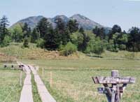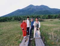 戸倉→鳩待ち峠→山の鼻→下田代十字路(与四郎小屋泊)→尾瀬沼→大江湿原→長蔵小屋→三平峠→一之瀬→大清水→戸倉 5月30日メンバー5人で一路尾瀬に向かう関越自動車道を利用して沼田ICで一般国道を奥日光方面に向かい途中、休憩を兼ねて吹割の滝を見学して来る。鎌田より国道を左手に入って行き戸倉の駐車場に車を止めて戸倉よりマイクロバスに乗り換えて鳩待峠まで行く、戸倉より先は一般者の通行禁止となっているため、鳩待峠を丁度12時30分尾瀬ヶ原の西の端の山の鼻に降って行く。天気は良好で気持ちも良く快適に歩いて行ける。 鳩待峠より約一時間山の鼻に出る、尾瀬ヶ原の眺めの良いテーブルに腰を下ろして昼食にする昼時なので此処でも大勢の登山者が昼食や休憩を取っている。いよいよ大草原(湿原)に設けられた木道歩きとなる、途中には池沼群が多く点在していて珍しい植物が自生している。 鳩待峠や山の鼻には大勢の登山者が休憩していたのだが尾瀬ヶ原を歩いて行くと殆んど人影が見えないほど静かで時折り数人の登山者のすれ違う程度だ。途中で何度か休憩を取りながらのんびりと歩く。竜宮小屋を通過して暫らく行くと遥か前方に今日の宿泊予定地の下田代十字路にある山小屋が見えてくる。自然と歩行がゆっくりとなる、下田代十字路は丁度尾瀬ヶ原と尾瀬沼との要となっている所で山小屋が数件ある。