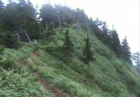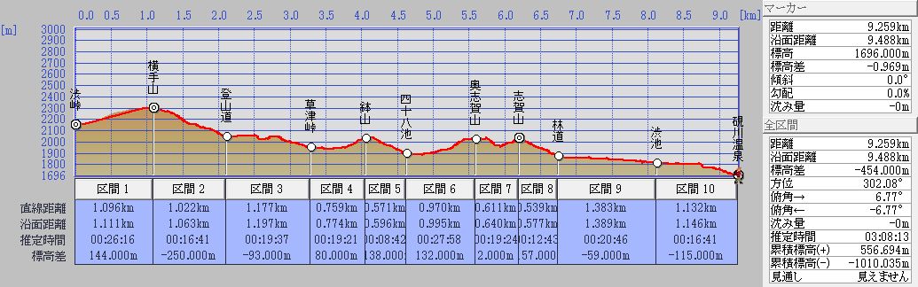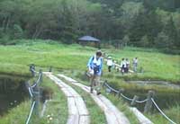 佐久→軽井沢→鬼押出し→万座→渋峠→横手山→鉢山→四十八池→志賀山→硯川→佐久 今年もT山荘にお世話になり志賀高原の渋峠から志賀山経由、熊の湯までのコースを歩く事にする。途中の浅間高原では高原キャベツの試食があり。渋峠で全員降りて2台の車の一台を下山予定地の硯川温泉前に置いてくる。渋峠からは歩いても僅かな距離なのだがリフトを利用して横手山山頂に登る。 横手山山頂からはスキー場に沿って草原を降る。明るくて気持の良い草原なので自然と足取りもゆっくりとなり、早めの昼食にする。 昼食後草原を降り樹林帯の中に入って行き草津峠の標識を越えるとクマザザの茂げる展望の無い鉢山登り路となる。鉢山を越えて下りきると目前に四十八池の湿原が現れて来る。休憩舎があり湿原を眺めながらの丁度良い休憩が出来る。