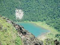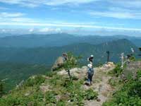 岩場の登山道には、>鮮やかな黄色の花を付けたイワオトギリソウの群生が続き、苦しい登りに一時の清涼感を与えてくれる。しばらく高山植物が群生する草原状の斜面を登ってゆくと砂礫の斜面となって森林帯より登って来る道と合流して目前に白根山山頂が迫ってくる。岩場の道を一登りすると日光白根山山頂のの一角に出る。山頂付近は大勢の登山客で賑わっていて丁度昼時なので各々山頂の景色と昼食を楽しんでいる。 2578mの奥白根山頂は狭いので隣の静かな岩峰で山小屋で作ってもらったお弁当を広げて昼食にする。山頂より目前に日光男体山と中禅寺湖が望め直下には五色沼、と弥陀が池がコバルトブルーの水を光らせている。今日は天気が良く雨の心配がないので山頂でゆっくり休憩する。しかし登山者が多いのには予想外だった。 ゴンドラの開通が大きな影響しているのだ。山頂駅より2時間で日光白根2578mの山頂に立てるのは登山者にとって大きな魅力だ。しかし登山するには十分な準備はして登ろう。山の天気は変わりやすく気温も変化が激しいので。 山頂で十分休憩をしたので弥陀ヶ原目指して急な岩場の降りを慎重に降りてゆく登って来る登山者とすれ違うのに所々で待機しながら交互に通過してゆく。登山者が多いので一列になって足並を揃えて降ってゆく。20分ほど降ると幾らか傾斜が緩やかになって周りを眺めるゆとりが出来、一面にハクサン石楠花の花が群生しているのに目を移せる。 前方右に五色沼、前方左に弥陀が池を見ながら降ってゆくと次第に石楠花の群生からカニコウモリの群生に変わってきて弥陀が池の分岐点に出る。今回の大きな目標の一つでシラネアオイを見に来たので弥陀が池湖畔を巡ってくる、しかし目的のシラネアオイはまったく見られなかった。...残念... 弥陀が池分岐に戻り七色平ら目指して下山道を行く、緩やかな明るい登山道を行くと次第にシラビソ等の針葉樹林帯に入って行き岩の露出した急な降りになる。30分ほど足元に注意しながら降ると平坦な道となり七色平の分岐となる。 七色平らに向けて平坦な針葉樹林帯の中を行くと辺りが明るくなり七色平らの小さな湿原に出る。湿原の端に一筋の木道が伸びている。木道を歩きながら湿原を良く見ると可愛いハクサンチドリ、ハクサンフウロ、イワオトギリソウなどが咲いている。今回の登山ルートの最後の見所になる湿原(七色平)で感動の山歩きとなって、疲れた体に元気を与えてくれる。 七色平分岐に出て登りに使用した登山道をゴンドラ駅に向けて降ると直ぐにほとけ顔の大日如来を見ながら樹林帯の降りをどんどん降る不動岩の岩壁を通過して路幅が広くなった際の岩には多くの杖が立て掛けてあった此処まで降って、もう杖は必要ないので登る人の為に置いてある様だ。ゴンドラ駅に無事到着、ゴンドラに乗車する登山者等が順番待ちで行列が出来ていたが約20分程度並んで降りのゴンドラに乗れる。 ゴンドラに乗るまでの20分間は目前に聳え立つ白根山との別れがたい時となった。上州の山並みを空中散歩している様なゴンドラからの眺めを十二分に味わってゴンドラを降りるとヤナギランの歓迎を受け感動の山行きとなる。再びペンション「コスモス」に戻り温泉に浸かり登山の疲れを癒し生ビールを一杯飲んで気分も最高...高原のベンチで一眠りしてから帰路を辿る。 |
