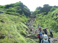 20日朝7時に出発お昼のお弁当を作ってもらい、車で5分ほどの日光白根ゴンドラ山麓駅まで行きゴンドラで約15分標高2000mの山頂駅まで一気に登ってしまう。ゴンドラからは上州の山々が見渡せて十分楽しめる。山頂駅の有る所は広い台地状になっていて目前に日光白根山の岩峰が聳え立っている。此処で水を補給して針葉樹林帯の中に出来た広い登山道を行く。 20分ほど平坦な道を行くと森林帯の狭い登山道となって次第に傾斜が大きくなってくる。血の池地獄の分岐を過ぎると急登になり大日如来の石仏が出て来ると平坦な道となり七色平の分岐に着く。山頂駅より約1時間。七色平からは樹林帯の中を30分ほど登ると岳樺の白い幹が目立つようになって来ると森林限界を抜けて岩壁の下に出てがれ沢を横切ってゆく。 視界が開けて休憩には丁度良い所なので20名ほど休憩をしていたが、何時岩が崩れて来るかも知れないので早々に通過する。一旦岳樺の林に入って一登りする。この林の中にはハクサン石楠花や、アズマ石楠花が見事に咲いている。林を過ぎると砂礫や草原の斜面となって眺めが良い登山道になる