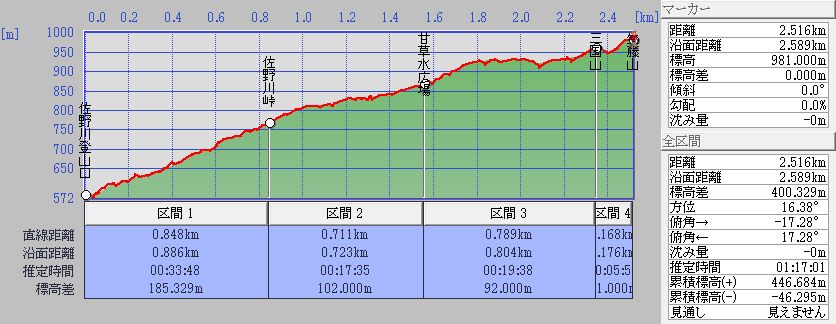 生藤山登山口12:00→佐野川峠12:40分→甘草水(昼食)13:30→三国山13:50→生藤山14:30→