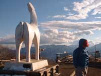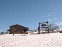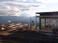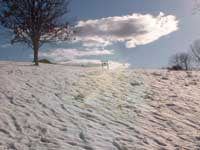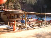 10分ほど休憩をしてから、目前の山頂を目指す、なだらかなドーム状の山頂は、地肌は一面雪で白一色で冬山の感じがする。陣馬山山頂標高855mに来ると風が一段と強く寒さも身に凍みてくる。山頂には5件ほどある山小屋のうち1件営業していたので小屋に入り暖かいカップラーメンを作って貰い小屋の中で食べて体を暖める。5名ほどの登山者全員外は強風で寒いので小屋に入って来て各々暖かいものを注文している。 今日は風が強く雲が飛び去って眺めは抜群によく午後になっても視界は良好だった。山頂の陣馬に別れを告げて下山する。 |