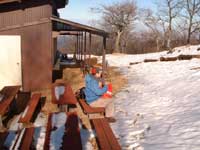 和田峠より約20分樹林帯を抜けて草原状と言っても雪原となっている所に出る。山頂の山小屋が見える、山頂直下の山小屋が有り此処で小休止、北方面には奥多摩の山並みが良く見える、谷を隔てて目の前には生藤山、茅丸、連行山と連なる、山頂は天気が良いが風が強い。