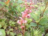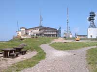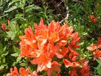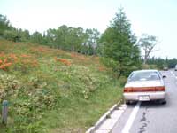 天狗の露地を登ってゆくといろいろの花が咲いている。特にレンゲツツジの花は鮮やかな朱色が際立って見える。駐車場より約30分王ケ頭山頂のホテルに到着する。すぐ裏にある美ヶ原頂上の王ケ頭2034mからの展望を味わう。眼下には松本の市街地が小さく見える。北アルプスの山波はあいにくガスに隠れて確認できない。