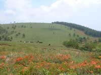 美ヶ原山頂付近を歩くと周りにはいろいろの花が咲いている。此処は一面草原で視界を遮る物がない為塩くれ場、美しの塔、山本小屋方面へとはるか彼方まで伸びる登山道が眺められる。王ケ頭で十分に山頂の気分を味わって再び美ヶ原高原駐車場に戻る。美ヶ原高原駐車場から武石峰辺りは山の斜面にレンゲツツジが満開になっていて緑と朱のコントラストが著しく目立つ 思い出の丘の駐車場に車を止めて思い出の丘まで登ってくる片道8分ほどで大きな標識のあるおかの頂に着く目前にには武石峰、後方にはオ王ケ頭の電波塔が立ち並ぶ頂が望める。車にもどり再び登ってきた美ヶ原林道を美鈴湖、浅間温泉経由松本に降りる。 |