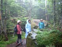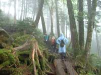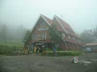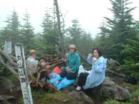 40分ほど丸山山頂で昼食をとっている間6名ほどの登山者が登って来ただけで天候のせいか静かな登山ルートーとなっている。昼食後丸山山頂を高見石小屋目指して降る。山頂より約20分高見石小屋に出る、小屋には多くの登山者がいて休憩している人、目前の高見石に登っている人、テントの準備をしている人...小屋のベランダにザックを置いて身軽な格好で目前の高見石まで登って来る事にする。大きな石が積み重なっているので石伝いによじ登る。霧のため視界はなし。眼下に白駒の池が有るのだがまったく姿が見えない。 高見石山荘より白駒池目指して森林帯の中を降る。20分ほど降ると緩やかな登山道となって暫く行くと木道に変わり滑らないように注意深く降ると前方が開けてきて白駒池に出る。池を一周するT字路を左に行き白駒山荘の前で休憩とする