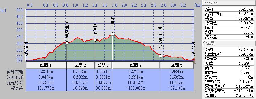 9月28日 大地沢駐車場→県界尾根→草戸峠→草戸山→大地沢青少年の家→大地沢駐車場 昨日の経ヶ岳ハイクに引き続き今日は同じく午後、時間が出来たので 草戸山まで行って来る。今日のコースは大地沢の駐車場に車を停めて、正面奥の町田市青少年の家の手前から右に県界尾根に上り、 左回りで、草戸峠→草戸山→左の尾根→青少年の家→駐車場に戻る周遊コースを歩いてくる。14時30分駐車場より野原を抜けて沢に沿った木道を進み、 青年の家の手前に有るアスレチック広場より右に登る登山道に入って行く、直ぐに男坂と女坂の分岐が有り、 県界尾根の手前で合流する。県界尾根は町田街道(館が丘団地)より尾根筋の道で展望が無く殆ど歩く人が居ない為道がはっきりしない所がある。 (拓殖大学の境界の有刺鉄線が草戸峠の近くまで有る)県界尾根を草戸峠に向かう、10分ほどで青年の家よりの登山道と合流して急坂を登りつめると視界が広がり15時草戸峠に出る。 草戸峠は高尾山が正面に良く見える所で、休憩ベンチがありハイカーが腰を降ろして休憩している。 草戸峠は高尾山口まで登山道が伸びているので多くのハイカーが利用している。草戸峠、 草戸山間は南高尾のメインルートとなっているので今日は20名程のハイカーと行き違う。 草戸峠からほぼ平坦な尾根を10分ほど行き一登りすると目前に城山湖(人造湖)越しに展望が開けて草戸山365mの山頂に出る。 広い山頂には休憩舎やテーブルがありハイカーが展望を楽しみながら休憩をしている。草戸山は城山湖周遊コースになっていて、 変電所際の駐車場より2時間程で城山湖周遊コース中、丁度中間地点が草戸山になっていて対岸に変電所が見える。 草戸山で15分ほど休憩を取ってから城山湖周遊コースを10分ほど行き大地沢方面の分岐で左折、周遊コースと分かれる。 尾根筋のピークにベンチが設けてある所を2箇所越した所から青年の家に降る道があったので直接青年の家に降る10分ほど降ると 16時10分青年の家の奥に有る工芸棟の所に出る。後は青年の家のメイン道路を駐車場まで10分沢に沿って戻る。 駐車場に戻ったのが16時30分で丁度2時間で戻ってきたことになる。身近な山歩きだが陽射しも強くなく涼風を身に受けて爽やかなハイクとなる、 夏の様相から紅葉はまだだが次第に秋の様相に変化しているのが感じられる。午後の短い時間の山歩きだが、大いにリフレッシュ出来た2時間となった。