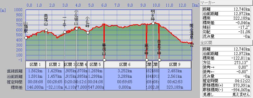 コース JR高尾駅9時⇒高尾山口→ケーブル山頂駅→高尾山山頂→城山→小仏峠→景信山→堂所山→底沢峠→明王峠→奈良子峠→姫谷温泉⇒藤野⇒高尾駅