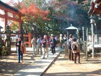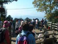 高尾山山頂で小休止としたい所だが、腰を降ろす場所が無い、しかたが無いので展望台よりガスの為薄く見える富士山を確認して山頂を降り次のピークのもみじ台に向かう。降り切った頃を一登りで茶店が有るもみじ台に上る。満員の茶屋を横目で見ながら通過する。しばらく行くと丁度良い場所があり小休止。高尾山から城山までのルートは明るく広いハイキング路となっていて所々に展望の利く場所があり、また要所要所に休憩舎とトイレの設備も有る。紅葉は一部で見られるが、まだ1〜2週間早いようだ。