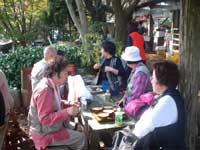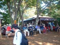 一旦緩やかな降りとなって再び急斜面を登り切ると、ナメコ汁が名物の景信山山頂に出る。早速ナメコ汁を8個注文して昼食にする。ナメコ汁の美味さに全員感心する、汗かいて登って来た甲斐がある。昼食を取り充分休憩をしたので、体力が回復する、目的の陣馬山を目指して出発する。景信山からは今までと変わってハイカーの数が少なく、静かな山歩きが味わえる、登山道も細くなり山道らしくなる、軽いアップダウンを繰り返し堂所山を巻き道で通過して、茶店の有る明王峠に16時到着、