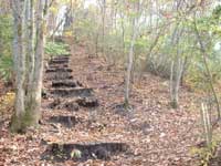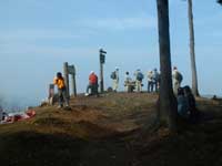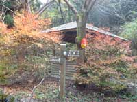 剣が峰の駐車場まで戻り、展望台に登って見る、都幾川方面(南側)の展望が良いが、ガスのため遠くは霞んでいる、周りには見事に紅葉したドウダンツツジの葉が陽光に輝いている。駐車場の前の斜面でもパラグライダーの飛行準備をしている。堂平山一体はパラグライダーの格好の飛行場所になっている。白石峠まで戻り、大霧山に向かう、4キロ程降ると茶店が2件有る定峰峠に出る。車が数台止まっていて峠の茶屋で休憩をしている。此処は桜の名所で桜の季節には花見客で賑わう所だが今の時期はひっそりとしている。 定峰峠を後に大霧山に向かう、峠より桜並木の続く道を降って行き、降り切った所が小川町よりバスが出ている白石車庫で、経塚、皆谷のバス停を過ぎ、橋場のバス停の所より左折して二本木峠と、粥新田峠の間の秩父高原牧場の一角の尾根に登る、360度の展望が有る広いところで数台の車が駐車してある、登山者も数人見られる。尾根道(林道)を5分ほど行くと粥新田峠の休憩舎があり10台ほどの車が停めてある、狭い林道なので、登山道を過ぎたところに車を停めて、登山開始とする。