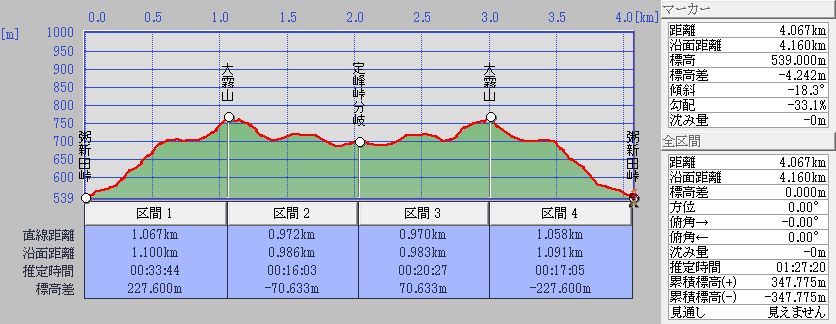 休憩舎の際の尾根筋を登って行く、明るい雑木林の中の登山道で、しばらく登ると階段が設けてある急斜面の登山道と巻き道がある、直進して登り切ると緩やかな尾根道となって再び急斜面の階段を登り切ると、標高766mの大霧山山頂に出る。山頂は北西部の展望が良く眼下に秩父市の街並みが少々ガスに遮られているが確認できる。秩父市の左手には武甲山の特異なシルエットが見える、秩父市の後方には両神山が有るのだが、あいにくガスで山の姿は何も見えない。 展望を楽しみながらの昼食を済ませてから、旧定峰峠方面に足を伸ばしてみる、左に有刺鉄線が張られている登山道を降り、放牧場に沿って尾根道を20分ほど行くと左に直角に折れる所に左、旧定峰峠の標識が有り。此処までで引返す。再び元来た道を辿り、大霧山山頂に戻った時は最後に残った4名の登山者が定峰峠方面に立去る所で去った後は、大霧山山頂を一人で独占!なんともいい気分に浸れる。14時丁度大霧山山頂を粥新田峠目指して降る。帰路は巻道を降って急階段の降りを避けて戻る。14時20分粥新田峠に戻る。帰路は小川町方面の橋場バス停に直接降る。橋場より東秩父村に入って、小川町の手前より西平小川線で松郷峠を越えて都幾川に戻り越生町を抜けて、高麗川の高麗神社で見学休憩....圏央道予定地に沿って、青梅、高尾を通過して帰宅(18時20分) |
