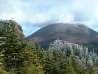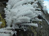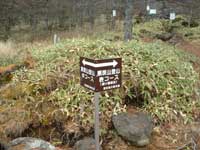 黒斑山山頂で充分休憩したので体力も回復し、次の峰、蛇骨岳に向かう(13:00)、一旦降り後はほぼ平坦な稜線歩きとなる、左側は樹林帯で右側は崖となっているので慎重に樹林帯側を歩く、黒斑山から蛇骨岳の間で5名ほど登山者とすれ違ったが蛇骨岳からはすれ違う登山者はいなかった。裏コースを登って来る登山者は少ないらしい。 黒斑山より霧氷が林立する蛇骨岳(13:30)に30分程で到着する。槍が鞘から浅間山を中心として蛇骨岳まで円弧を描いて20度ほど移動した事になり。浅間山(主峰)が前掛山の左に時折白煙を噴上げている。蛇骨岳山頂は 岩、草、樹木、全ての者に氷が着いていて霧氷の芸術品展示会場のようだ。此処で浅間山と別れて樹林帯の中を降って裏コースを辿る。次第に北に向かって40分ほど降ると左に折れるように方向を変えると平坦なクマササの茂る明るい唐松林となり20分ほどで中コースの分岐点を過ぎて車坂山を巻いて行くと登山開始した車坂峠に15時丁度に辿り着く。