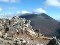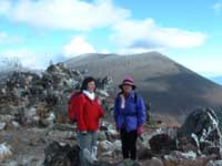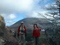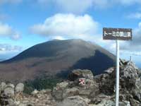 10時丁度車坂峠より表コースを黒斑山目指して出発する。唐松の疎林を登り始めると15分ほどで車坂山に出るが展望は無い、草原状の気持ちの良い登山道をひと降りして、登り返すとガレ場に出て背後の水の塔山、篭の登山の全容が望める。再び樹林帯の中を登って行くと次第に霜柱が多くなりスリップに注意しながら登る。 トーミの頭と槍が鞘の間に浅間山の姿が見えてくる、山頂は雲が懸かっているが雲が移動しているので時折浅間山全容が見えてくる。避難用シェルターを過ぎて槍が鞘のピークに出る(11:26)。此処からは第一外輪山の稜線を辿るルートとなり右手に常時、浅間山を眺めながらの登山となる。 登るにつれて次第に天気も良くなり浅間山山頂が良く見える。浅間山は3重式火山で、今いる所は第一外輪山で湯の平のカルデラを経て第二外輪山の前掛山が見えていて、浅間山の主峰は前掛山の左後方に僅か頭が見えて、時折水蒸気爆発で白煙を噴出しているのが見える。