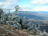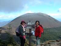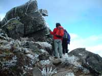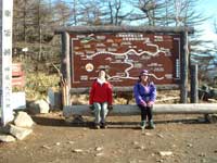 槍が鞘での展望を楽しみ一旦僅かに降りトーミの頭の急登になる。登りつめると目前に雲も切れた浅間山の全容がはっきりと見える。樹林には霧氷が出来ていて雪を被った天然のクリスマスツリーが林立していて、太陽光に乱反射して見事な光景となっている。山頂付近は西風が強く吹いているが登山道は西側にある樹林に遮られて比較的楽に歩ける。 トーミの頭からは登山道も緩やかになり右手に湯の平に降る草すべり路を見送り、直ぐに中コースとの合流点を過ぎ、目的の黒斑山標高2404mの山頂に出る(12:10)。気温が低く寒いので日当りの良い山頂の一角で昼食にする。お湯を沸かし暖かいインスタント食品で体を温める。山頂には10名ほどの登山者が昼食休憩をしていて時々浅間山にカメラを向けている。
