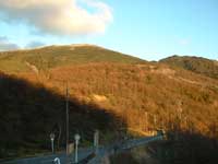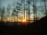 早速峠の際に建つ高峰高原ホテルのこまくさの湯に浸かり、心身ともに疲れを癒す。時間が早い為か?大きな展望風呂に入浴者が3名でゆったりできる、南側が全面ガラス張りで左から奥秩父の山、富士山、八ヶ岳、蓼科山が良く見える。温泉で温まり外にでると気温が低く身が引き締まる。太陽が低くなり先ほど登って来た黒斑山が赤く染まってくる、帰路の途中、唐松林の彼方に夕日が沈んで行く光景で一日の幕なる。 |