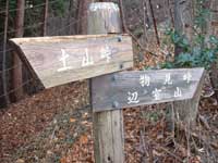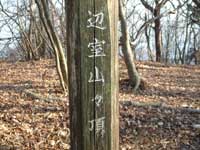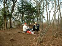 明るい雑木林の山頂が目前に見えてくる、辺室山山頂か? 山頂の僅か手前に標識が有り辺室山三角点と書かれていて際に境界線の石柱がある。土山峠より約1時間20分辺室山山頂644mに到着する。山頂は明るい雑木林の中で視界は木々の合間より眺められる程度だが、三峰、丹沢、蛭が岳、仏果山などが確認できる。早速持ってきた食料を取り出して昼食の準備。インスタントラーメン、お赤飯のおにぎり、パン、コーヒー...