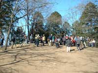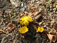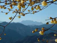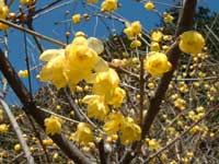 登山口より約30分宝登山山頂に出る。山頂は多くの登山者、観光客で賑わっている、南の斜面には蝋梅の林があり満開となっている、暖かい陽射しを受けて多くの人が丁度昼時で昼食を楽しんでいる。山頂より左回りで奥社の階段を下りロープウェイ山頂駅に行くと順番待ちで行列している。山頂駅際の梅林はまだ早く一部紅梅の花が咲いている。日当たりの良い梅林の中でも多くの人が昼食を楽しんでいる。山頂駅際の斜面には福寿草の花も咲き出している。 梅林より山頂方面に蝋梅園があり、太陽の光を受けて鮮やかに輝いて香りを漂わせている蝋梅の花を見学する人たちで賑わっている、黄色の艶のある花はいっそう暖かさを感じさせてくれて、まだ北風が吹く時期でも此処だけは一足早い春の感じがする。
