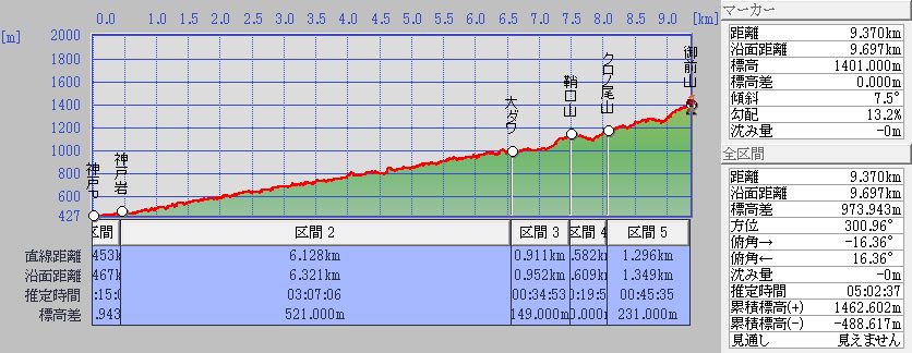 長い林道歩きで疲れているが折角来たので頑張って御前山山頂を目指す、非難小屋の際を登って行き小さなピークの鞘口山1142mで小休止、重い足取りで次のピーククロノ尾山1070mで再び休憩、御前山山頂が近くになって来たが、なかなか足取りが重たい、ぬかる急な登山道を登って行くと右前方に非難小屋が見えてくる、右手方向に非難小屋を見ながらぬかる路を登り詰めると明るく広い御前山山頂に出る。14時16分 山頂で素早く遅い昼食の支度をして急いで食事を済ませる。登山者は我々二人のみで静かな陽だまりの山頂をゆっくりと味わう事ができる。 山頂でゆっくりしたい所だが15時を過ぎているので、御前山山頂を後にする、山頂より5分ほど降った所にある非難小屋に寄ってみるとまだ新しく布団なども用意してあり年配の男性一人が非難小屋で泊まる準備を済ませていて、後は温泉が有れば最高だ!!と言っていた。後は登ってきた登山道を辿り大タワに戻り長い林道歩きをして(二ヵ所ほどショートカットする)神戸岩に戻る。トンネルを抜けず沢に沿って付けられた岩壁の道を鎖に捕まりながら通過する。薄暗くなった神戸岩を過ぎ土砂崩れで林道が寸断された所を仮設の道で通過して神戸の駐車場に戻る。 |