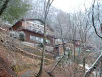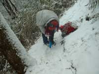 折角なので雲取山荘を経由して三条タルミの下山コースを取る、 雲取山山頂を後にして樹林帯の中の急な降り道を約30分 雲取山荘に出る、雲取山荘と三条タルミを結ぶ登山道は雲取山の巻道となっていて所要時間30分と地図に明記してあったが 約1時間を費やした、巻道は踏み後がなく、急斜面もあり、道幅の狭くて不明瞭な所があり、冬の積雪時には避けたほうが良い。 三条タルミの500m程手前で数人の足跡が引返しているのが確認できた(雲取山を越えて雲取ヒュッテに行ったらしい)足跡が確認できた時はホッとした。