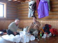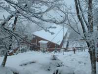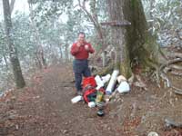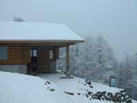 雲取山山頂にある避難小屋に入る。今日の天気では登山者が来ないのか? 山頂には誰も居ない、三条の湯から雲取山山頂まで一人も登山者と逢わなかったし新雪に着いた足跡も我々二人の足跡のみが山頂まで続いている。 靴を脱ぎ小屋の中に上がりザックより荷物を取り出して昼食の準備、二人で大いに昼食を楽しんでいると数人の登山者が登って来る。 山頂より武蔵野市のSAさんと無線交信、レピーターを利用してどうにか交信できた。 SAさんも今回雲取山登山を予定していたが仕事の都合で断念、我々二人が代行登山となる。...充分雲取山での楽しさを味わった事だし、 時間もあるので下山する事になる。
