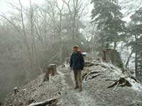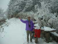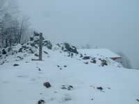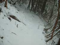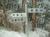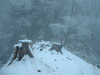 三条沢に沿って山の斜面に出来た登山道を30分行くと三条の湯の山小屋(鉱泉)に着く、 此処で水の補給をして直ぐに出発、三条沢を渡り水無尾根の急斜面を廻り込んで水無尾根の青岩谷側を登って行くと直ぐに青岩鍾乳洞の分岐が有り (青岩鍾乳洞方面は通行止)此処でお湯を沸かしコーヒーで一息つく。 水無尾根の斜面を坦々と登って行く、急な階段状の所が無く楽に歩けるが変化が無い、 次第に辺りが白く雪化粧になってくる、大きな切り株のある開けた尾根に出たが視界が悪く目前の三ツ山の姿は見えない。再び水無尾根の斜面を登って行くと、 雪も多く降って来るのと併せて登山道も次第に積雪が多くなりスリップしてしまったので、此処でアイゼンを取り付けての歩行となる。 水無尾根を登り切ると三条タルミ(奥秩父主脈縦走路)の稜線に出る(11:28分) 休憩をしたい所だが雪が降っているので、頑張って雲取山山頂まで行き山頂でゆっくりと休憩する事にして、急斜面の登山道をゆっくり登って行く 苦しい登山となる。20mほど先を鹿の群れ(六頭ほど)が登山道を横切って行く、だんだん頭上が開けてきて雲取山山頂に到着(12:20)