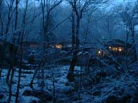三条タルミに着いた時は雪も小降りとなっていたので休憩ベンチの所でお湯を沸かして コーヒーで一息入れる(16:20)サアー 後は元来た路を引返すのみ、水無尾根の斜面を坦々と2時間降って行く、朝から降っている雪が5センチほど 積もっている登山道を降って行き、朝登って行くときは雪が無かった三条の湯付近まで白く雪化粧しているのでアイゼンを付けたまま青岩谷橋まで降る(18:23)雪明りを頼りに林道際の車に戻ると車の上に5センチほど雪が積もっている。今日は久々の雪山登山を充分楽しめた。 |