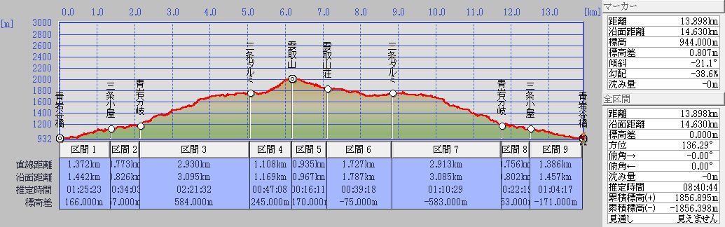 青岩谷橋→三条の湯→青岩谷鍾乳洞分岐→尾根(切り株)→三条タルミ→雲取山山頂→雲取山荘→