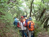 12時10分万二郎岳山頂に到着する。山頂は樹林で覆われていて展望が無いが近くの岩の所で用意してきたアンテナを設置して伊吹山に登っているSさんと無線で呼びかけたが応答なし、アンテナの方向を変えてみたが受信出来る局は静岡、御殿場方面で、名古屋方面の無線局は受信できず Hさんが山頂で待機してくれるので荷物を置いて、カメラと無線機を持って一人で万三郎岳に向かう、山頂を少し降ると岩が露出した所があり富士山が眺められる。20名ほどの登山者が万二郎岳に登ってゆく、一人が岩場に登って来たので、後方に富士山が見えると教えると、早速富士山を眺めて歓声を漏らしている、先に登ってゆくグループの人たちに声をかけて呼び止めている。 万二郎岳を降り切って万三郎岳との間にある馬の背の登りの途中に岩場があり万二郎の全容が眺められる、左の斜面にはトラバースして来た白く崩れた部分が見える。岩場より万三郎岳方面に登りつめると平坦なアセビ(馬酔木)林のトンネルとなる。万三郎岳には一旦下って万三郎岳の登りとなるので、此処までで引き返す事にする。 万二郎岳山頂で待機していたHさんと荷物をまとめて団体さんも10分ほど前に降って行き、静寂となった万二郎岳山頂16時10分下山開始、静かな山路をゆっくり降る、登る時は多くの登山者と出会ったが、下山時は途中で2人出会ったのみで、静かな山歩きが出来る。17時20分登山口の駐車場に戻ると先に下山したツアーの人たちが大型バスに乗り込んでいる。 天城山には非常に多くの登山者(ハイカー)が訪れている。特に団体で歩いている人が多く、大型バスを利用して天城峠より八丁池、万三郎岳、万二郎岳を経て天城高原までの6時間のコース(案内人が付き添う)が人気となっている様だ。天城高原登山口の駐車場に待機していた大型バスも馬の背で擦れ違った30名ほどの登山者の待機バスで、○○観光天城山石楠花ツアー書かれた看板が見える。次回はツアーコースをと思いながら帰路を辿る。 |