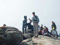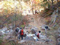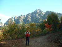 瑞牆山荘前の林道を右に入った所には200台ほどの駐車場が設けてあり大型バスも来ている。早速登山準備をして8時20分瑞牆山を目指す。御殿場より来た男女三人と話しながらの樹林帯の登山道を登ってゆく、3人は我々とは違う山、金峰山に行くとの事で、富士見平で右、金峰山 左、瑞牆山の分岐点だが、途中で我々は林道経由富士見平に向かう。 瑞牆山荘より約30分林道が尾根先を回り込んだ所で瑞牆山の全容が目前に見えて来る、朝日に白い岩肌を輝かせた岩峰が林立する姿は生涯忘れられない感動の山と成るだろう。また西側には八ヶ岳の峰峰が青空を背景として連なっている。林道の終点から再び登山道に入って10分ほど登ると明るく開けてきて富士見平に出る富士見平小屋があり宿泊も可能のようだ、富士見平には30名ほどの登山者が一息入れて右金峰山、左瑞牆山へと登ってゆく。 富士見平を後にして左瑞牆山に向かう飯盛山の西側斜面の薄暗い樹林帯の巻道を小川山の分岐まで行くと急降下の登山道となり、降りきった所の天鳥川を石伝いに渡ると休憩場所があり10名ほどが休憩をしている。(10:00)天鳥川より本格的な岩の多い急な登山道が続き、階段やロープの設置してある所を数箇所通過する、登るに連れて登山者も多くなり一列になって狭い登山道を登って行く。だいぶ高度が上って来て振り返り見ると金峰山が見える。