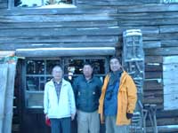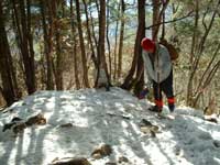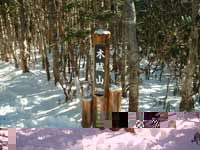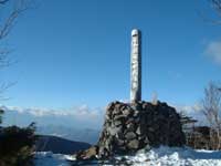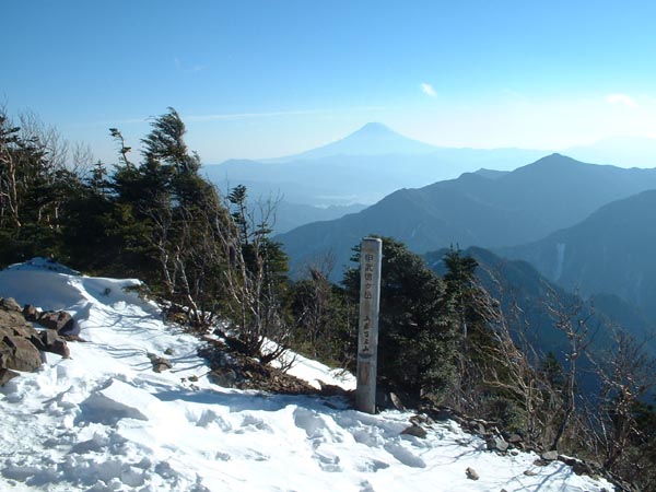 明るい内に下山するには此処より引返さなければならないが、懐中電灯も用意している事だし、折角此処まで来ている事で最終目標の甲武信ヶ岳を目指す事にする。岩場での展望を満喫して再び樹林帯の中に出来た登山道を行く、木賊山を巻くようにほぼ水平に行くと樹林帯の中で稜線に出て左に僅か登って行くと樹林帯の中に標高2468m木賊山山頂の標識がある。 岩場で追い付いてきた単独登山者が木賊山山頂で一息入れて先に甲武信小屋目指して降ってゆく、我々は此処で遅い昼食にする、気温が低く風もあるので素早く準備、インスタントのカップラーメンを主にパン、ソーセージにおにぎりを素早く食べる。甲武信ヶ岳までの時間を地図で確認する、 甲武信小屋まで下り20分、小屋より甲武信ヶ岳山頂まで登り20分。出来るだけ早いタイムで戻って来るにはザックを此処に置いて行く事にする。50Cmほどの積雪がある樹林帯を降りガレ場を通過して甲武信小屋に出る、小屋に寄らず直ぐに甲武信ヶ岳山頂を目指す、小屋までは降りで空身なので楽に降ってしまったが小屋からは急な登りで歩行がスローダウン、後僅かで甲武信ヶ岳山頂に辿り着くのだと我が身に言い聞かせて重い足を一歩一歩進める。 疲れた足取りで樹林帯を登り詰めて甲武信ヶ岳山頂の一角に抜け出る、風が強く雲が吹き飛んでしまい青空が広がる素晴らしい天候になっている。15時00分目的の甲武信ヶ岳山頂に辿り着く、山頂からの展望に感動、”感動の山”甲武信ヶ岳山頂でしばらく展望を楽しむ。歩き初めて8時間30分長い山歩きとなった。甲武信ヶ岳山頂は360度の展望で記念撮影をしながら山座道程、確認出来た主な山、北から反時計回り 御座山、天狗山、男山、瑞牆山、金峰山、国師岳、乾徳山、富士山、三つ峠山、大菩薩嶺、雲取山、和名倉山、武甲山、両神山と素晴らしい景観に感動。 甲武信ヶ岳山頂の展望をゆっくり楽しみたい所だが時間が遅くなってしまったので早々に切上げて甲武信ヶ岳山頂を降る。樹林帯に入る手前の岩場から眼下に甲武信小屋が見える。 甲武信小屋に寄って通称”徳ちゃん”(甲武信小屋の主人山中徳治さん)と記念撮影、お土産として甲武信ヶ岳(日本百名山)登頂記念の2005年のミニカレンンダーを頂く、気さくな山小屋の主人”徳ちゃんに”お礼を言って甲武信小屋を後にする。今回は下見と言ったところなので、次回は泊まりでゆっくり来ますので!!。