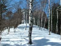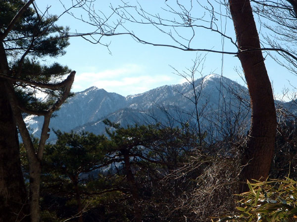 山頂の展望を期待してきたが、期待は消え去る!!。山頂まで針葉樹林があり東側以外の展望は望めない。山頂に展望塔があり登ってみたが樹林の方が成長して高く登ってもあまり変化なし、期待していた富士山の影も形も見る事が出来ず、東側の景色を数枚撮影して展望塔を降りる。残念なので姫次方面に行こうとしたが積雪で歩き難いので残念だが引き返す事にする。 巻道の分岐まで下り此処で簡単な昼食にする。丹沢山と蛭が岳が良く見える所なので展望を楽しみながらの休憩となる。 11時35分もと来た路を引き返す途中で登ってくる登山者一人と逢う、登りで一人すれ違っただけなのであわせて二人、意外とこの時期は登山者が少なく静かな山歩きが出来る。休憩ベンチがある近くまで下ってくると下のほうからエンジン音が鳴り響いてくる、何かと思っているとバイクが2台登って来たので、この先はとてもバイクでは無理だよと声を掛けてあげる。しばらくしてバイク2台は戻ってくる。 降りは快調に歩けて13時8分林道に辿り着く後はのんびり林道を15分戻れば焼山登山口のバス停に戻れる。林道より振り返り見ると焼山が大きく聳えて見える。13時20分車に戻り帰路を辿る。富士山が見えない事は残念だったが感動の山歩きが出来た。次回は雪のない時期に姫次辺りまで行き富士山を思う存分眺めて見たい。 |