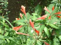 ハ菅山山頂付近にはアスレチックコースがあり格好の運動場所と成っている。 山頂には休憩舎があり、展望塔もある。展望塔に登って見ると丹沢山を背後に関東平野が一望できる、 あいにくうす曇なので遠望はないがハンディー機で武蔵野市のJA1OAO局と無線交信が出来る。 山頂からわずかに戻り鳶尾山方面に降ると休憩舎と池があり 亀や鯉が泳いでいる。池を眺めているとカワセミが飛んで来たので撮影しようとしたが素早く消え去ってしまう。池から沢に沿って5分ほど降って行くと駐車場と休憩舎(トイレ付)と 芝生の広場がありミニ自然公園となっている。 車道を行くと直ぐにハ菅神社正面から鳶尾山に続いている道路に出る。雨が降った後なので山から流れ出る水が道路を覆って流れている。 ハ菅神社に向かう道路を歩いて行くと草むらの中に朱色の?ランや木の枝先には胡桃の実が大きくなっている。写真を撮りながら15分ほどでハ菅神社の駐車場に戻る。