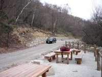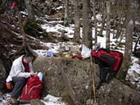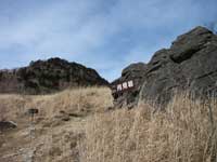 月見岩を後にして草原の端に朽ちた標識が立っていた。 後でガイドブックを見たら此処が扇平で国師が原に降る分岐点になっている事に気付く。いよいよ針葉樹林帯の中に 入って 積雪のある登山道となり大きな岩が次第に多くなる。次第に風が強くなって来て頭上をゴォーと 音を轟かせて吹き抜けて行く、樹林帯を15分ほど登った所で小休止をする。お湯を沸かしてコーヒータイム、燃料が無くなり沸騰しなかったが 暖かいコーヒーで冷えた体が幾分温まる。 休憩している間に山頂より2人の登山者が挨拶を交わしながら降って行く。 天候の影響か今日は登山者が殆どいない。再び山頂目指して登り始める、 大きな岩を廻りながら超えたり鎖を頼りに岩を登ったりして山頂直下の鎖場まで辿り着く。ストックは岩登りに邪魔になるので途中に置いて来る。 今度は重たいザックを置いてから、ほぼ垂直に15mほどの岩登りだが、風が強いのと気温が低いので山頂へは回り道から登る事にする。しかし回り道も不安定な荒木の梯子や岩の上の雪が凍っているので慎重に登って行き、山頂に到着する。 乾徳山2016m山頂からの展望は360度の視界を堪能できる。 昨年の同じ日に登った甲武信ヶ岳も木賊山と並んでいる、金峰山の五丈岩も確認できる。後方には 端正な姿の富士山も良く見える。天気が良ければ山頂でゆっくりする所だが風が強く寒いので何枚か写真を撮り早々に引き上げる事にする。登る時よりも降るほうが足のホールド位置を探すのが難しく 慎重になる。風が強く雪が凍っているので岩の表面を這う様にして後ろ向きで降る事になる。 以前来た時(1973年8月5日)は 大勢の登山者に混ざって難なく山頂に登った記憶があり、天候によってこれほど登る事が難しくなる事が解る。尤も33年も以前の20代の事なので。難所を数箇所降り、扇平の草原に戻った時には緊張感が 一気に安らぎ足取りも軽やかになる。分岐点の月見岩まで戻り国師が原経由下山する。月見岩からは草原の中をほぼ一直線に国師が原 (元大平小屋があった所)迄降る。 国師が原の十字路には大平小屋は無く西に 100m程の所に唐松と白樺の林の中に避難小屋がある。十字路から林道跡を大平牧場に向かう。道満尾根目指して緩やかに登ってゆく、 此処も国師が原の一角で以前は此処も牧場として使用していたらしく所々に鉄線の柵が残っている。国師が原の十字路から20分ほどで往路の登山口に到着、 道満尾根を僅かに下りすぐに大平牧場方面の標識に従って林道を下り休憩テーブルのある駐車場に14:55分戻る。帰りには以前大弛峠(国師岳登山) からの帰りに寄った牧丘の鼓川温泉で心身を癒し気分爽快で帰路を辿る。 |