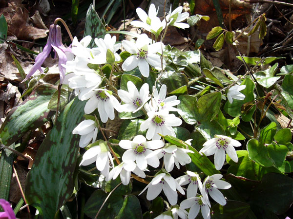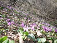 人里近くで多くの花が自然のまま残っている事に深く感動する。写真を撮りながらの登山で予定時間をオーバー、一旦ピークを越して笹原の中を降ってゆく、笹原の中にも所々に雪割草やカタクリ等の花が見られる、前後に10名ほど登山者が見られる、地元の人らしき中高年の人が多い。再び登り道となり、一面に紫色の花を付けたカタクリの花の海となる、カタクリ花に混ざってキクザキイチゲ、アズマイチゲ、イカリソウなどの花も所々で見られる。後ろからどんどん登山者が登ってくる為め素早く写真を撮っては登り、また写真を撮っては登りと忙しい登山となる。 山頂直下まで延々と続くカタクリの群生に感動し、花に眼を奪われ1時間40分の急登を終えて標高481.7mの角田山山頂に辿り着く。多くの登山者が至る所で昼食や休憩をしている広い山頂を一回り後(10:06〜10:12)帰路は灯台コースを下山する。次第に多くの登山者が登ってくる角田山山頂を後に桜尾根と灯台コ−ス分岐まで戻り、桜尾根を右手に見送り三望平、三望小屋を通過して五ケ峠分岐点を通過する。五ケ峠分岐点まではほぼ平坦な登山道で所々にカタクリの花が見られる。分岐点を過ぎると急な降り路となり再び両側の斜面にはカタクリが群生している。ここでもしばし足を止めての撮影になってしまう。