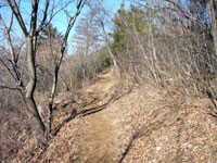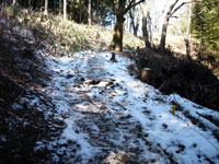 登山道の日影の所には雪が解けずに残っているが凍っているのでスリップの注意は心配なく楽に歩くことが出来る神社のある尾根筋まで南側の斜面を登ってゆく。太陽を背に浴びるので暖かくのんびり歩ける。