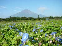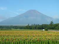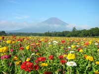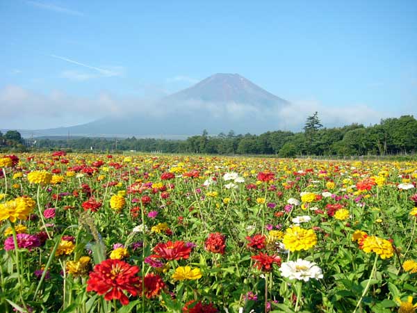 忍野の花の都に寄って見ると百日草が丁度見ごろで赤、黄色、白、ピンクの鮮やかな色を太陽の光を反射させていて見応えのある景観を作り出している。近くにはブルー一色の朝顔畑もあり絶好の富士山の撮影ポイントになっている。