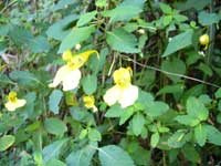 山頂より約50分針葉樹林に変わり足元には黄色のツリフネソウや終わりかけたキバナアキギリの花が多くなり関沢登山口(林道)に出る。林道を5分ほど行くと往路登山口(山ノ神コース)の駐車場にたどり着く。