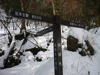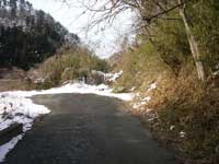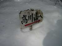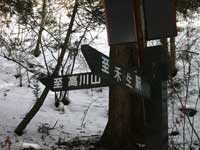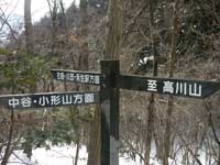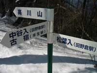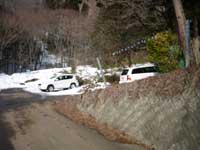 古宿までは案内標識が要所要所にあり迷わず行けたが古宿から先の道が解らず30分ほど迷い歩く。古宿の道路が分岐する所に案内標識があり登山道の確認が出来る。古宿の数件ある民家の所を右方向に続く林道を行き大棚の民家2軒在る所に出る。先ほど此処まで車で登って来たが道路の積雪が深く車での走行は無理なので引き返した所だ。雪を踏みしめて林道を登って行く。
