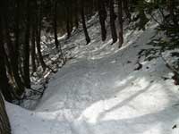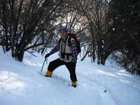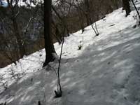 シラノ沢登山道を左手に見送り林道を更に10分ほど登って行くと林道の終点となり5台ほど駐車スペースが在るが今日は積雪で車では登ってこられない。此処からは山の斜面をジグザグに登って行き高度が上がって来るのが感じられる。